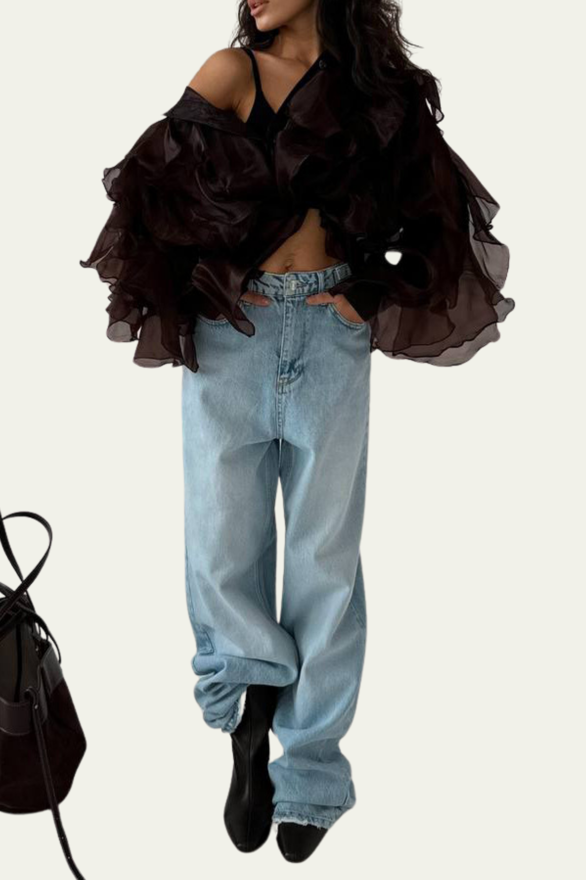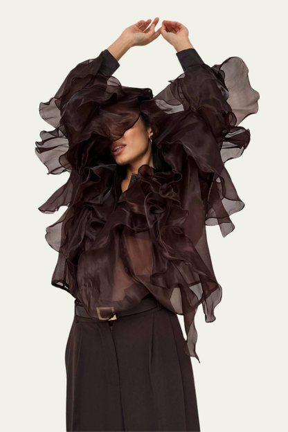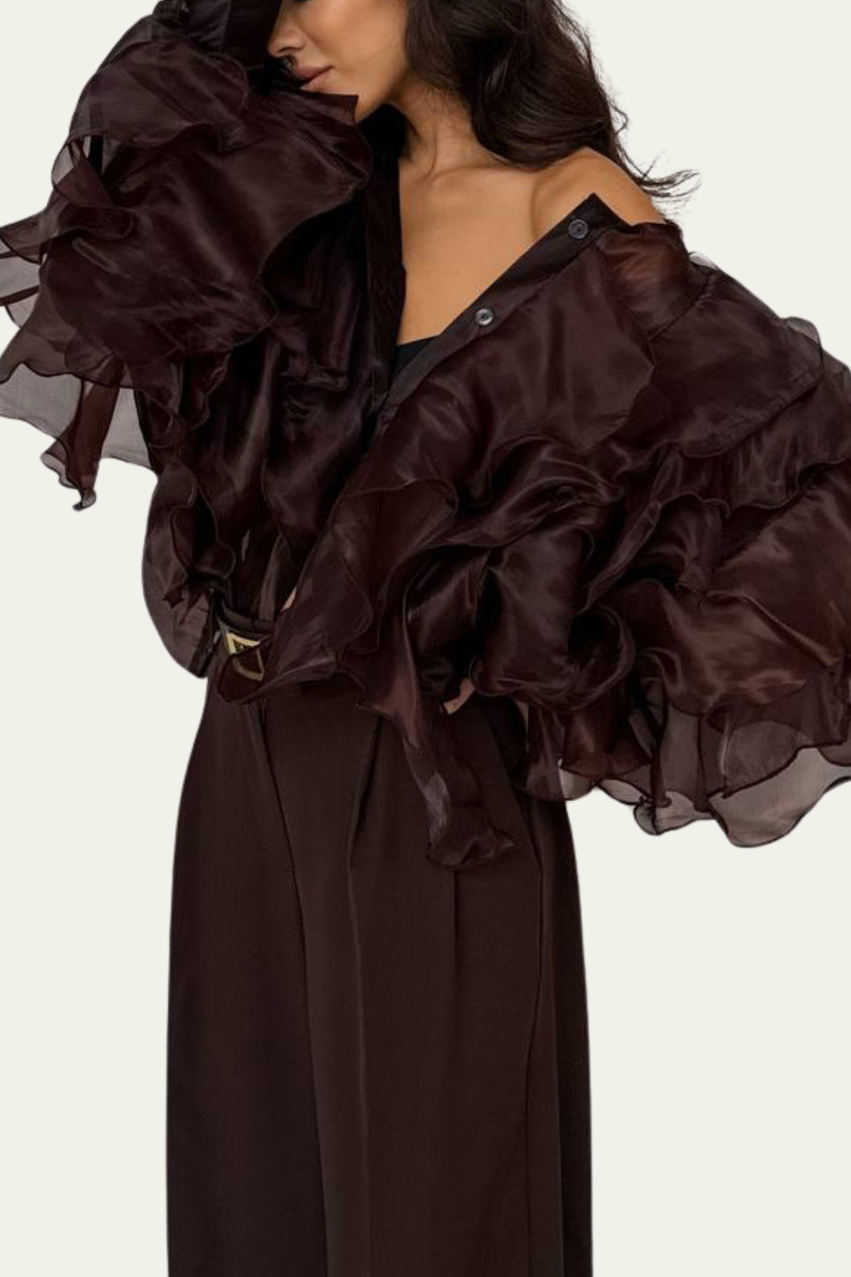 Introducing the Teagan Ruffle Mesh Shirt. This elegant and sophisticated shirt features delicate ruffles and a mesh fabric, creating a unique and stylish look. With its airy design and comfortable fit, this shirt is perfect for any occasion. Elevate your wardrobe with the Teagan Ruffle Mesh Shirt.