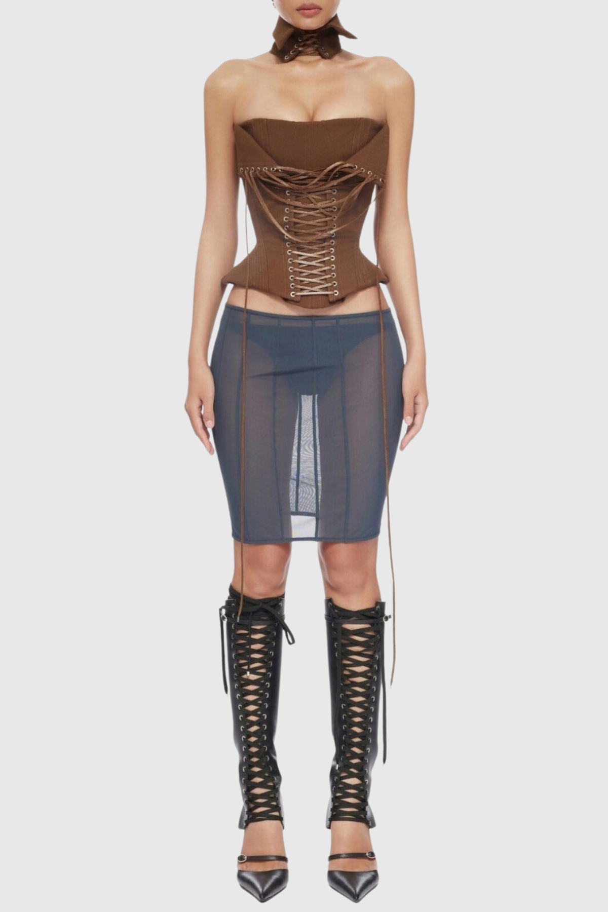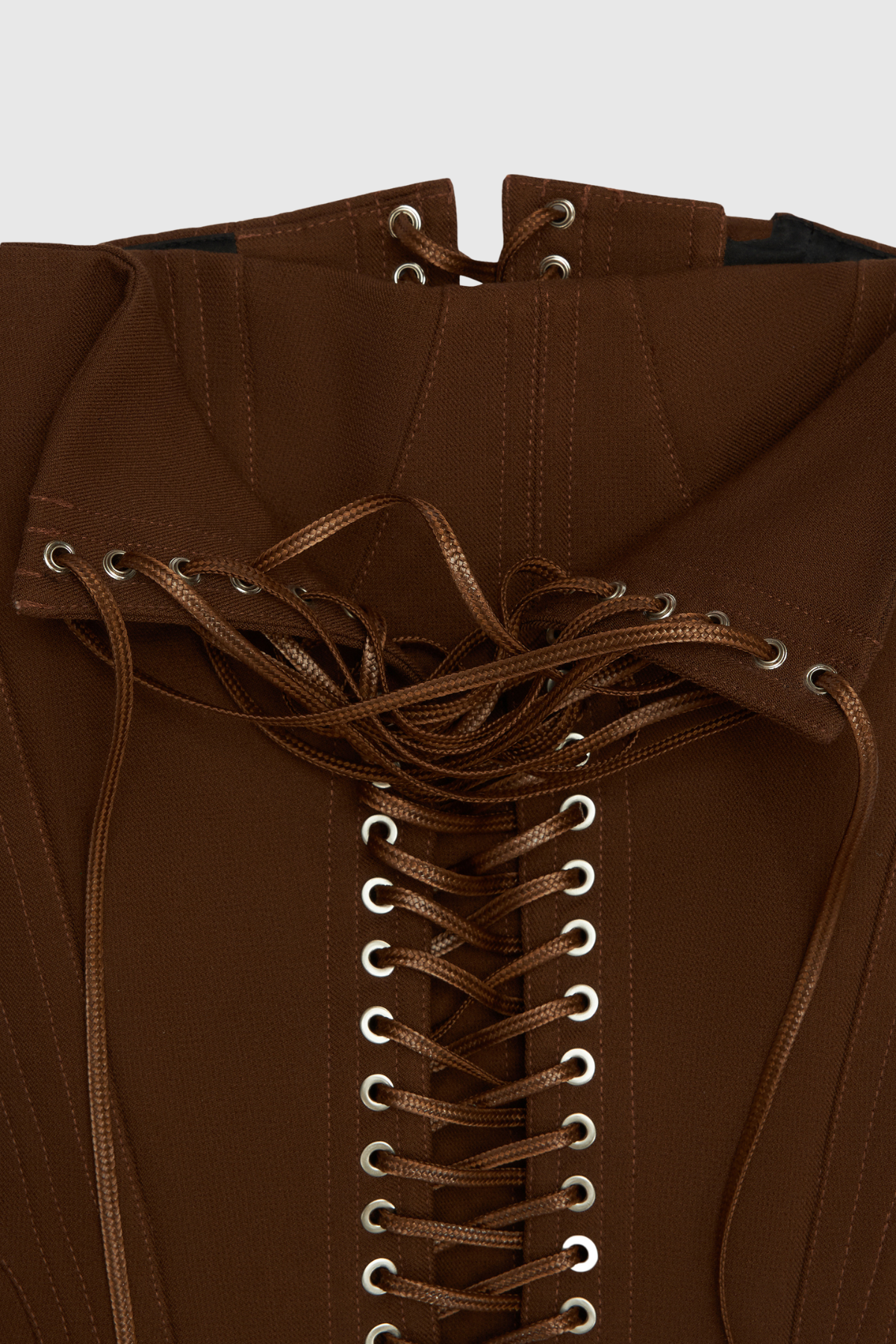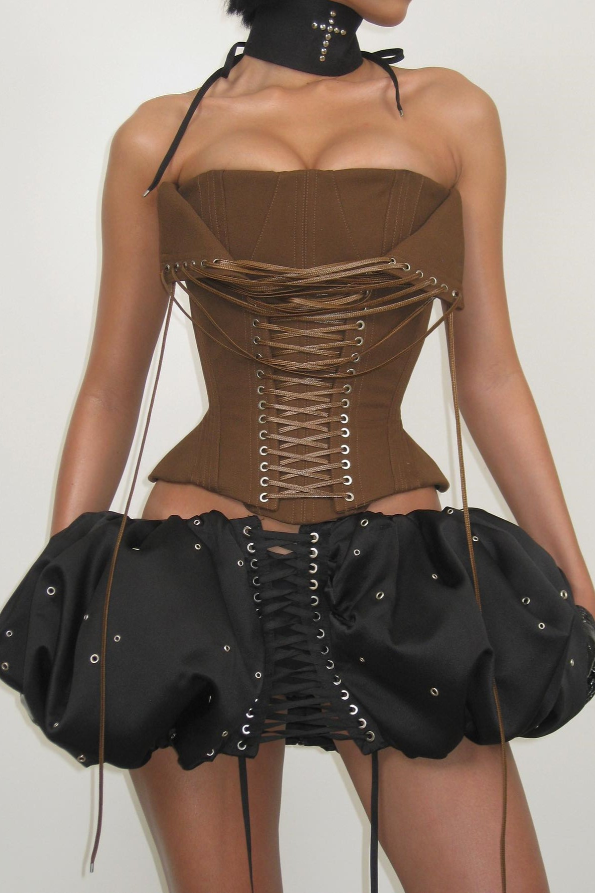 The Zariah Corset Lace Up Top combines structured tailoring with timeless elegance. Featuring a precision-engineered corset silhouette, this piece delivers refined shaping through boning and strategic seaming. The lace-up front closure offers adjustable fit and a striking design detail that transitions seamlessly from day to evening wear. Crafted for those who appreciate architectural fashion, this top pairs effortlessly with tailored trousers or flowing skirts for versatile styling options.